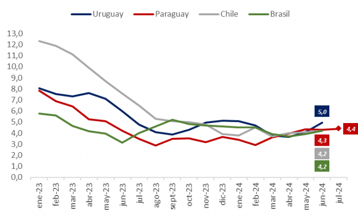 Adicionalmente, en comparación con otros países de la región, hasta el mes de junio, debido a que algunos países aún no han publicado datos de julio, se observan inflaciones interanuales similares a la de Paraguay. En este contexto, tanto Chile como Brasil presentaron tasas del 4,2%, mientras que Uruguay exhibió una ligeramente superior (5,0%).